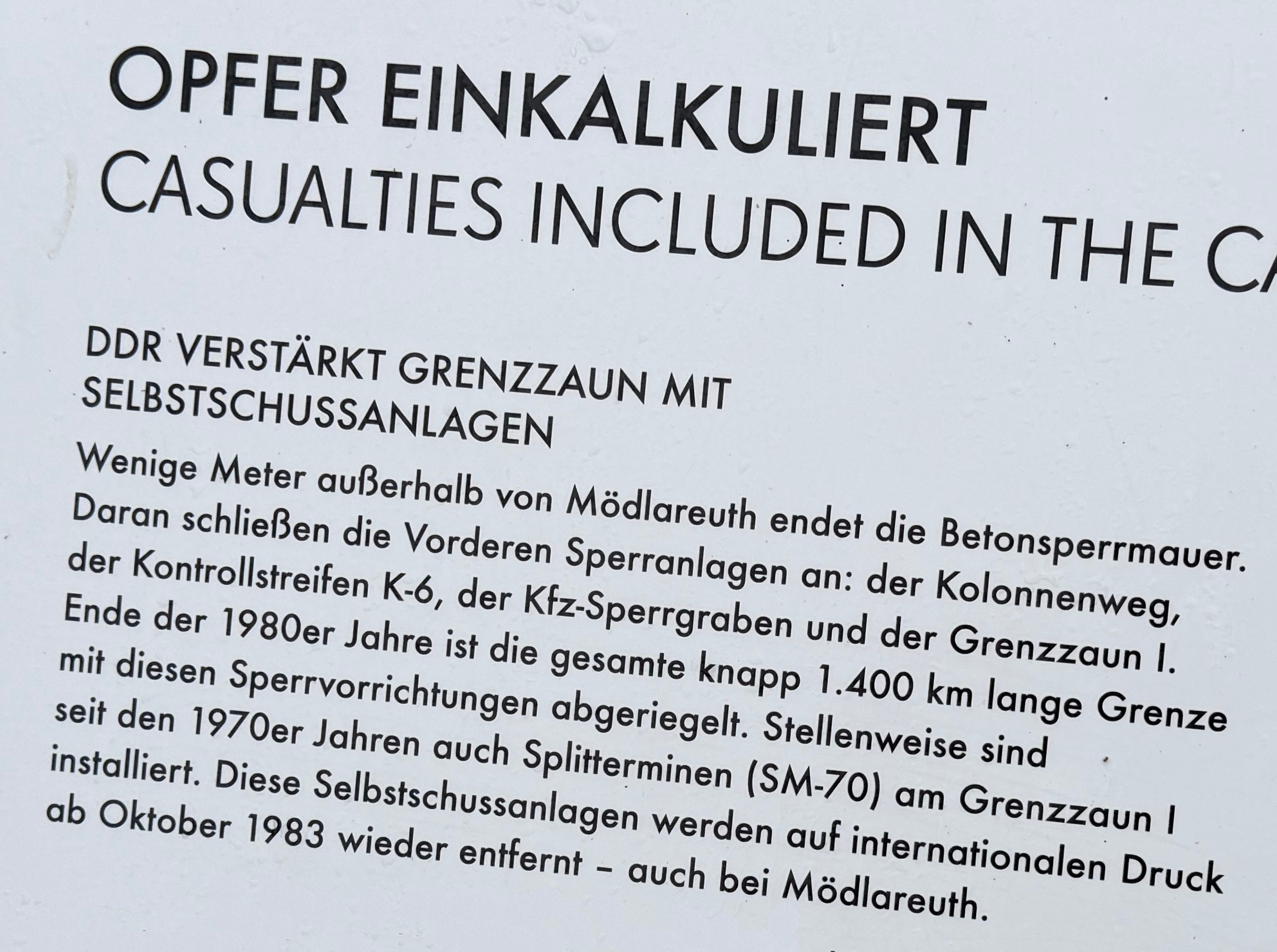Tabulka s nápisem: OPFER EINKALKULIERT - NDR posiluje hraniční plot automatickými střeleckými systémy. Vysvětlení k zábranám.