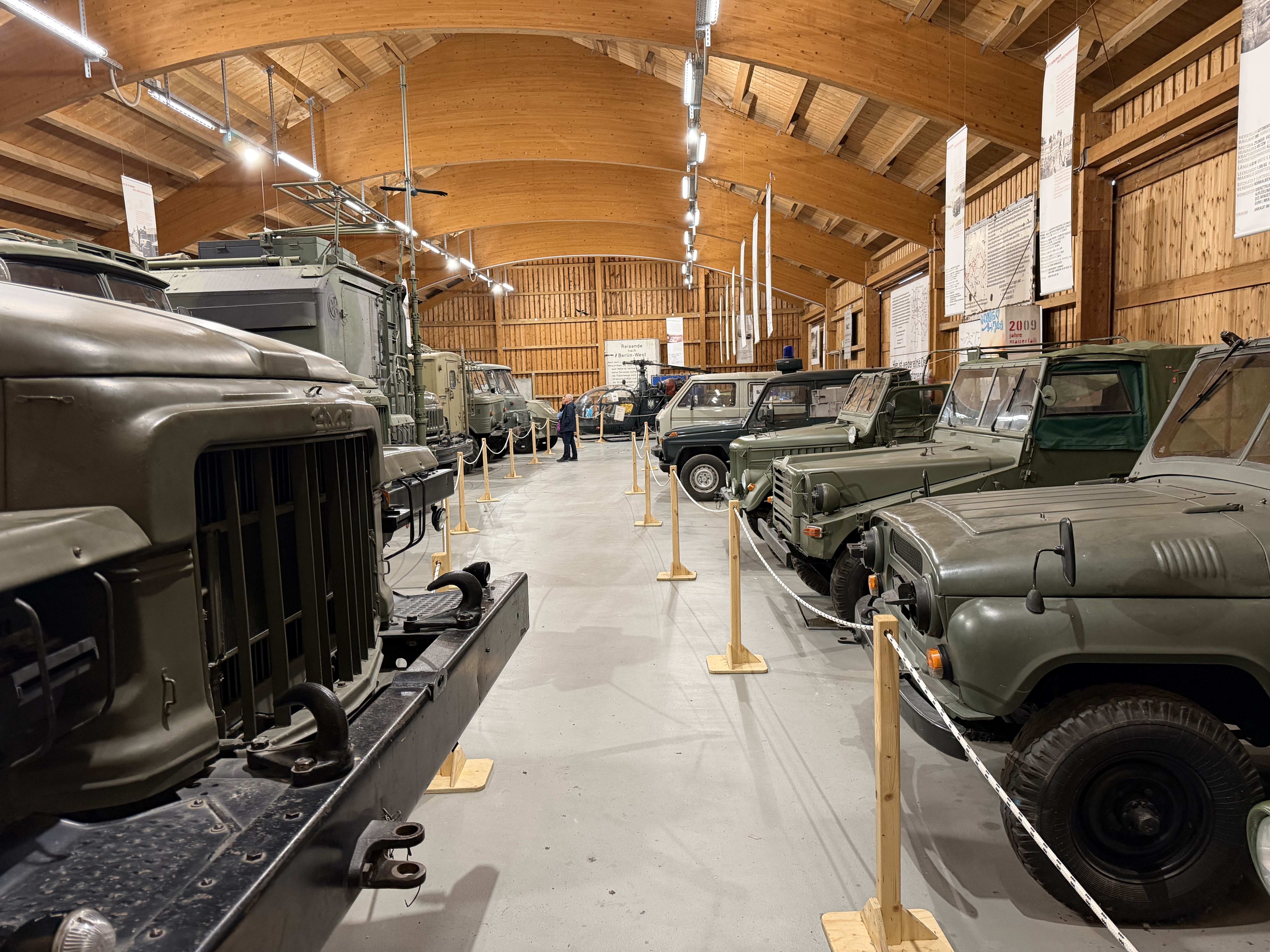 Vojenská vozidla ve vojenské zelené barvě v hale pro vozidla s dřevěnou střechou a dřevěnými stěnami