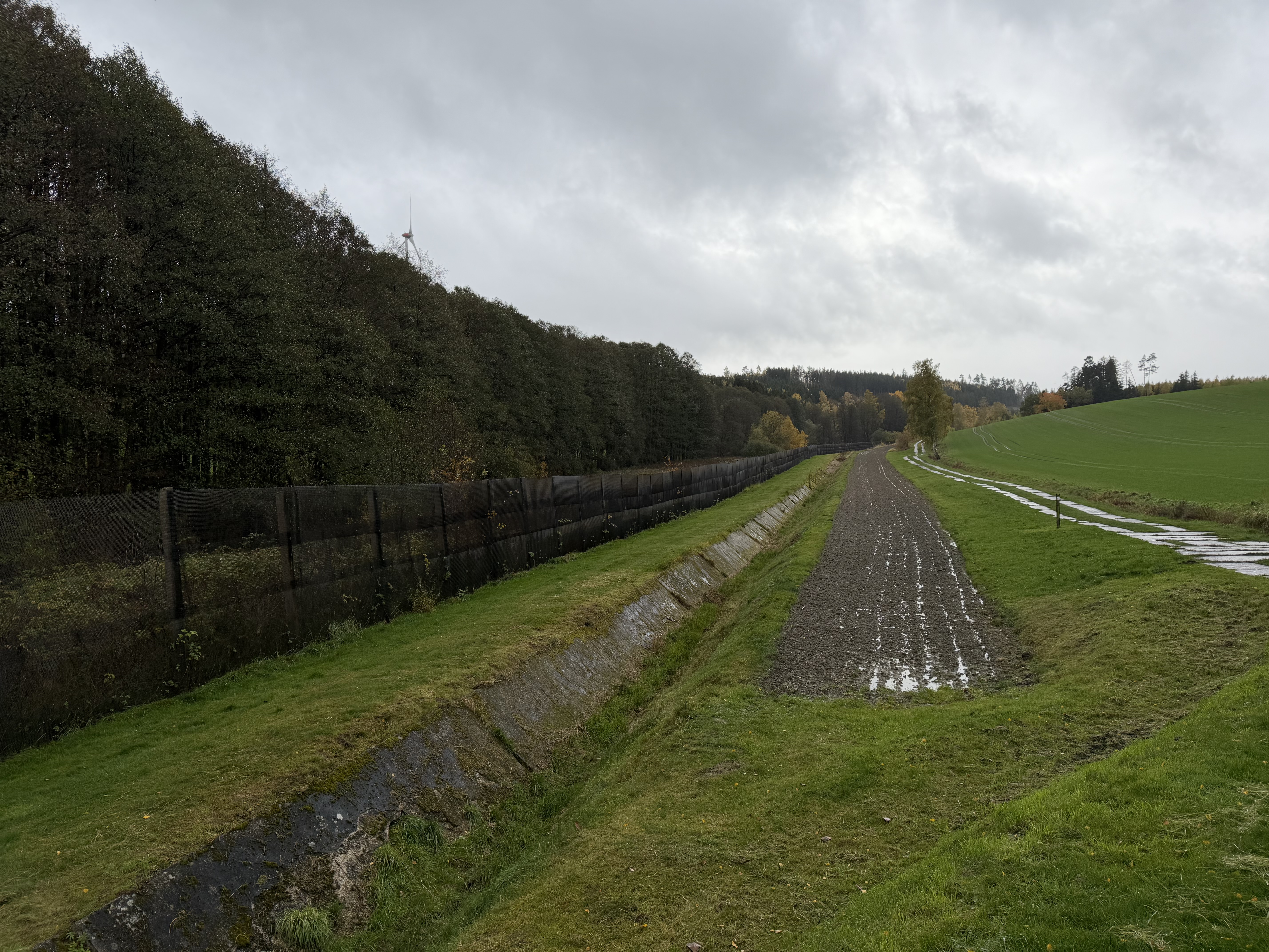 Zde jsou jednotlivé úseky hraničního pásu: plot, příkop a kontrolní stezka pro hlídky.