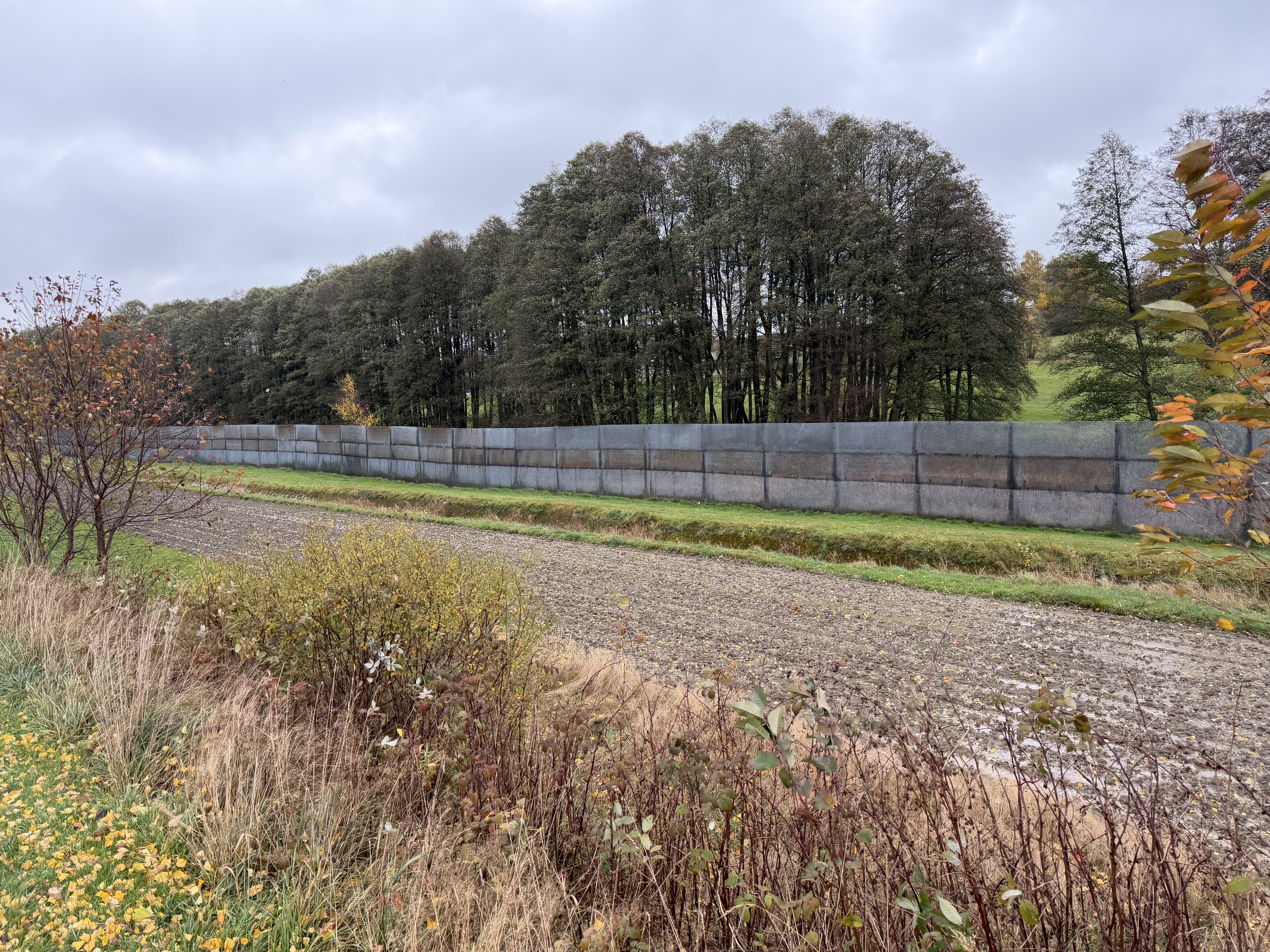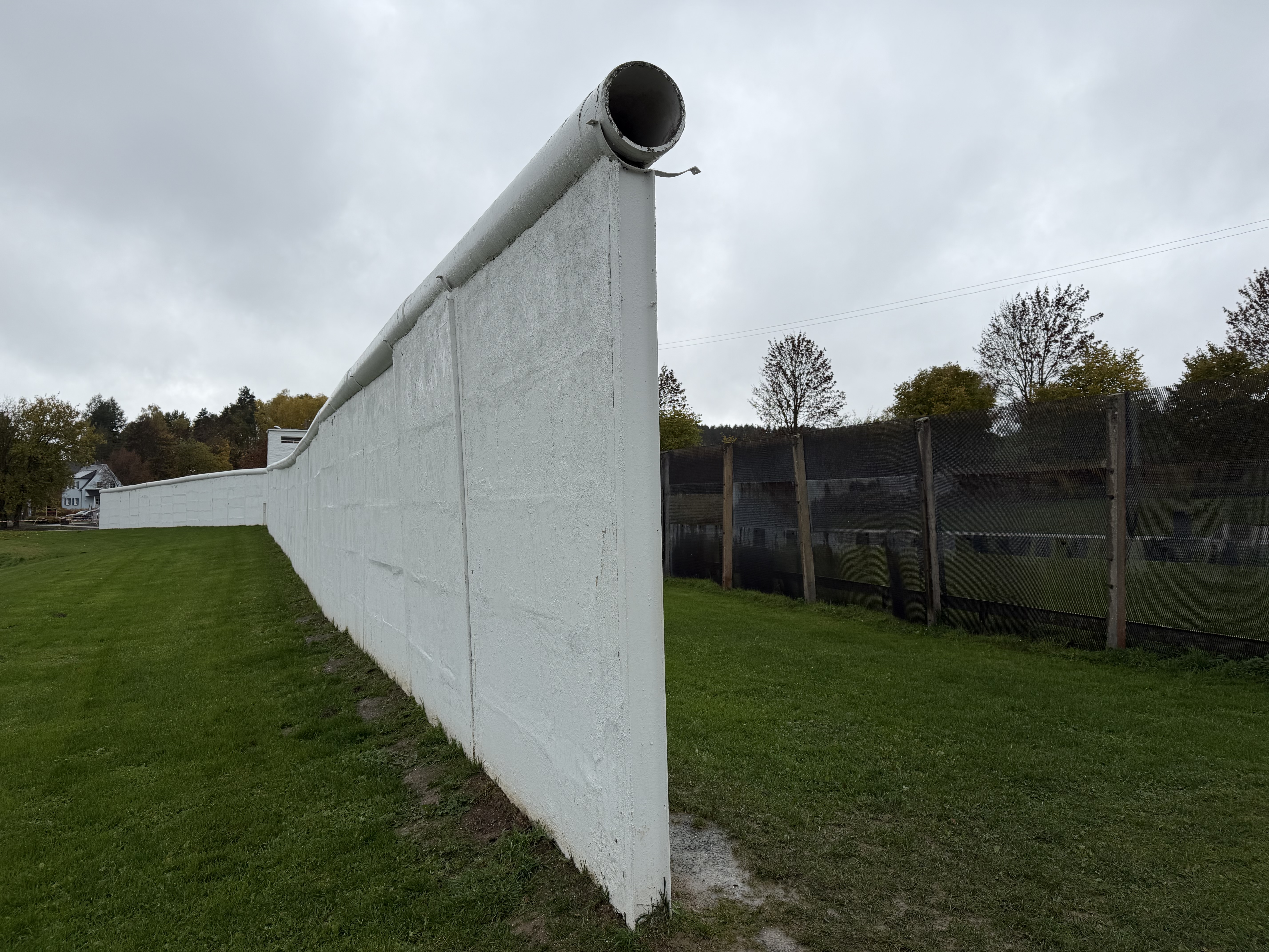 Za zamračeného počasí bílá zeď za loukou a příkopem. Na louce je umístěna cedule. V pozadí stromy a hraniční věž.