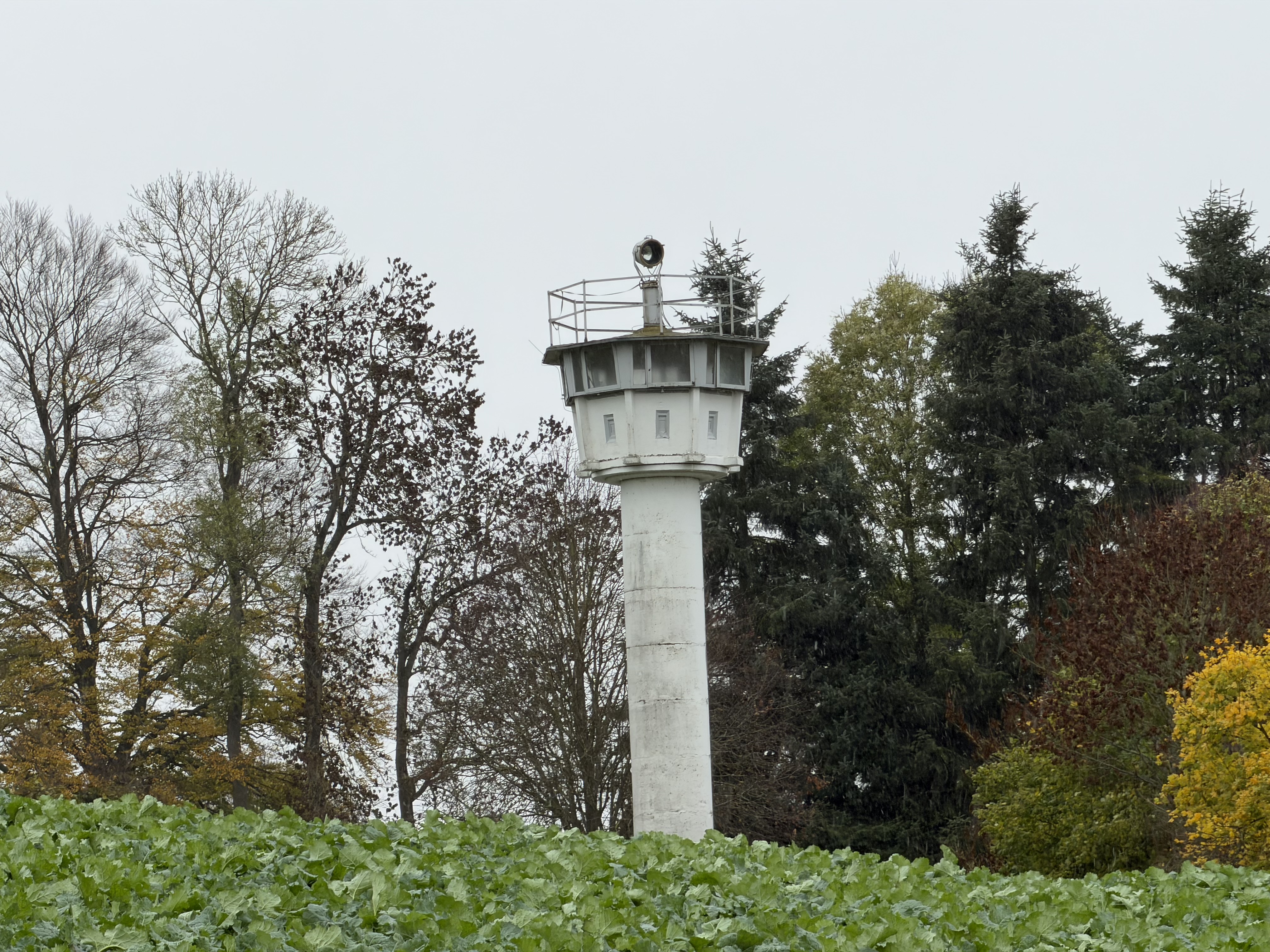 Hraniční věž NDR bez pilíře, hranatá, s ambity, okny a světlometem za zábradlím na střeše
