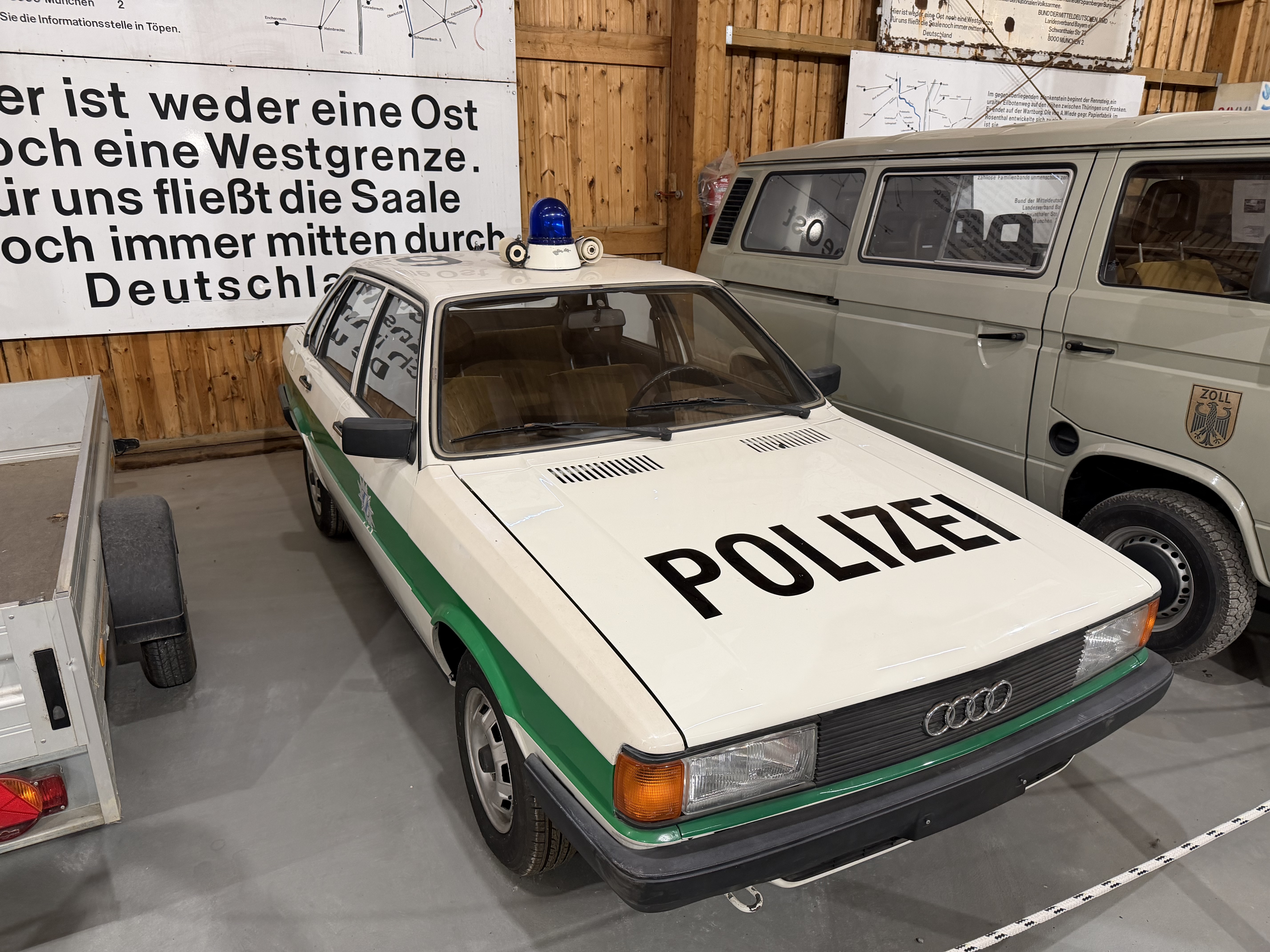 Bílozelené Audi s modrými světly jako policejní vůz, na kapotě černými velkými písmeny nápis POLIZEI